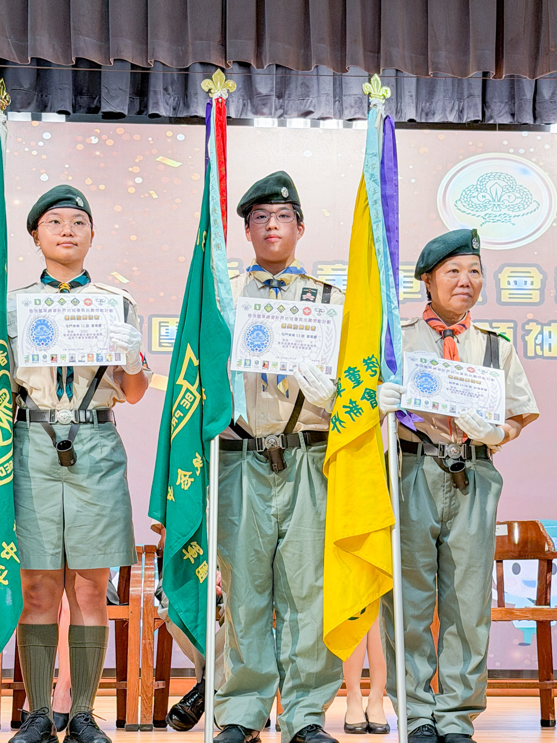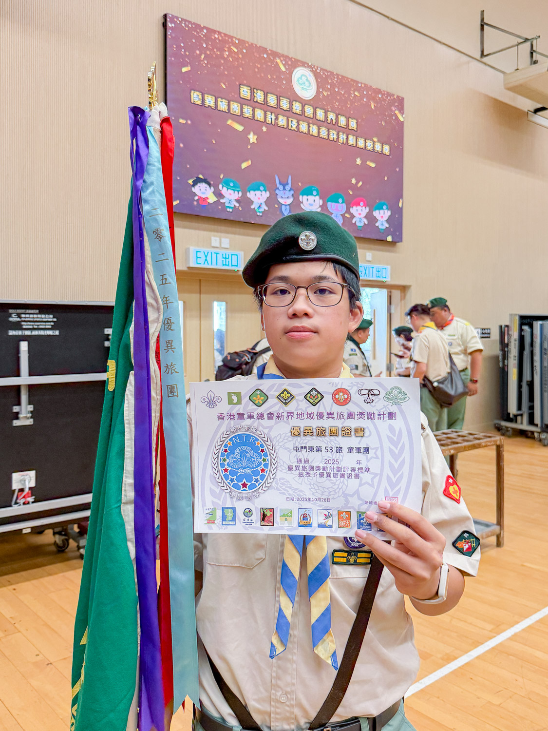 2025年11月16日,這份榮譽迎來了光榮時刻。2B班陸弘向同學代表沈中童軍團出席頒獎禮,從嘉賓手中接過象徵卓越的旅團彩條及證書。這條彩條不僅是掛在團旗上的裝飾,更代表了旅團在過去一年裡,於技能學習、紀律培養及社區貢獻等方面均達到了業界認可的高標準。
