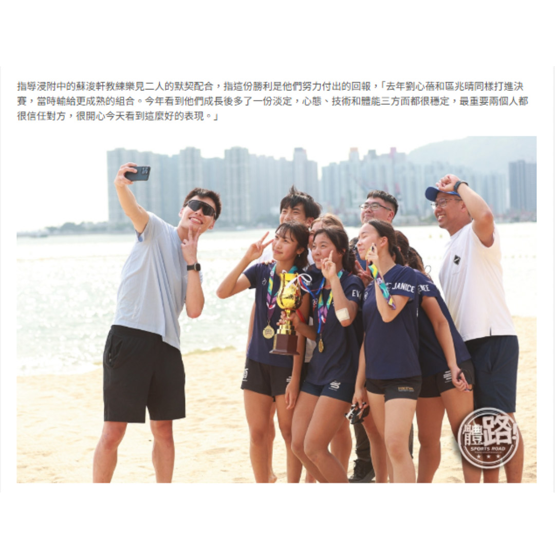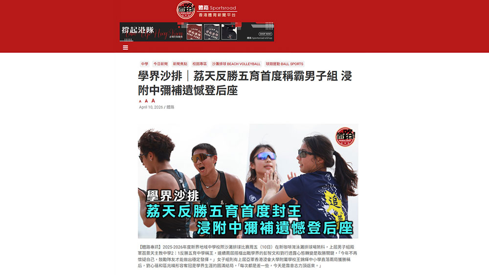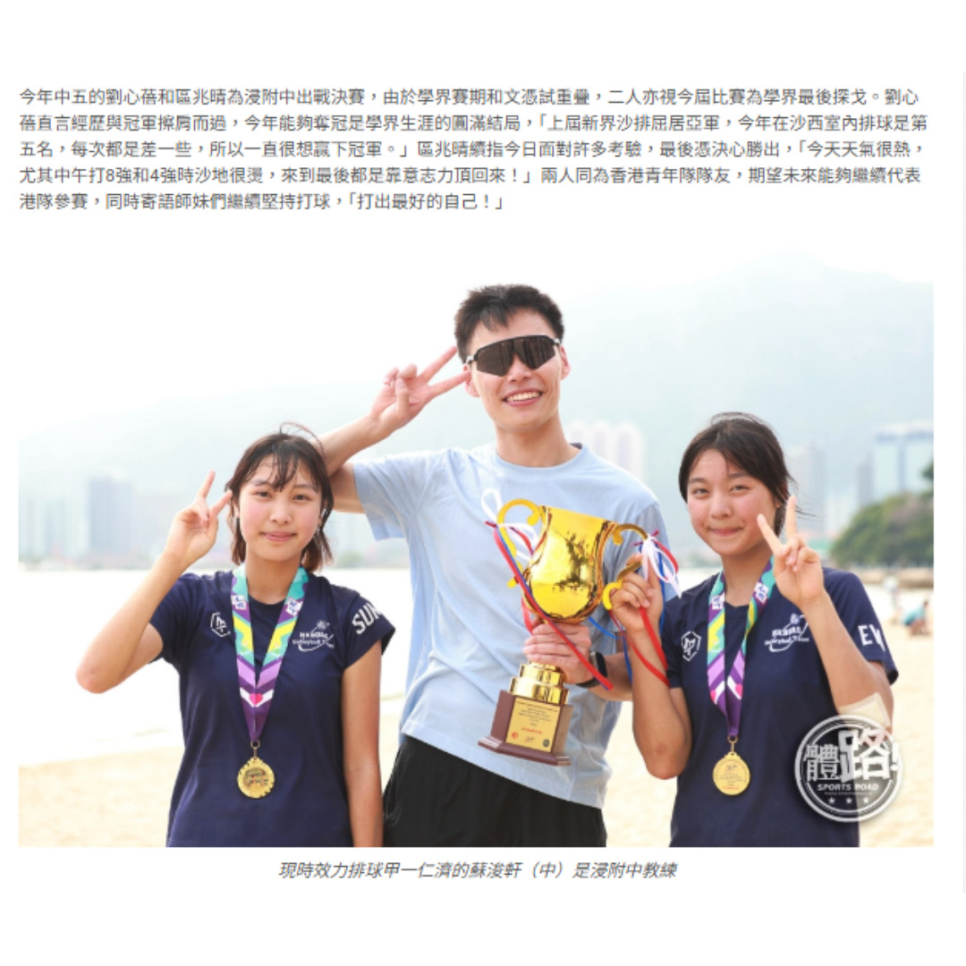 [傳媒報導 體路] 荔天反勝五育首度稱霸男子組 浸附中彌補遺憾登后座【體路專訊】2025-2026年度新界地域中學校際沙灘排球比賽周五(10日)在新咖啡灣泳灘排球場煞科,上屆男子組殿軍荔景天主教中學2:1反勝五育中學稱王,連續兩屆搭檔出戰學界的彭智文和劉行透露心態轉變是取勝關鍵,「今年不再懷疑自己,鼓勵隊友才能做出穩定發揮。」女子組則有上屆亞軍香港浸會大學附屬學校王錦輝中小學直落兩局獲勝稱后,劉心蓓和區兆晴形容奪冠是學界生涯的圓滿結局,「每次都是差一些,今天是靠意志力頂返來。」