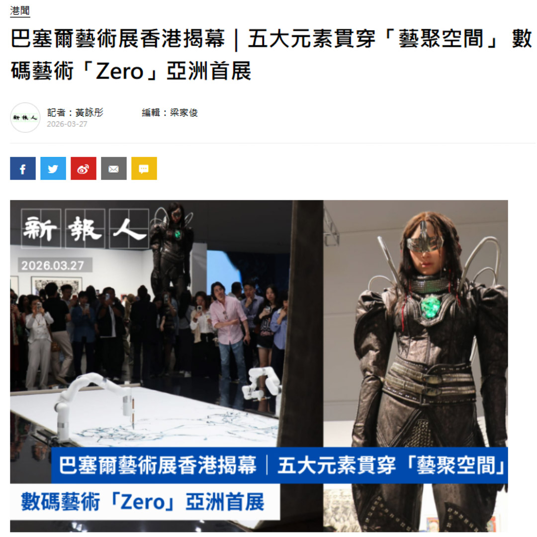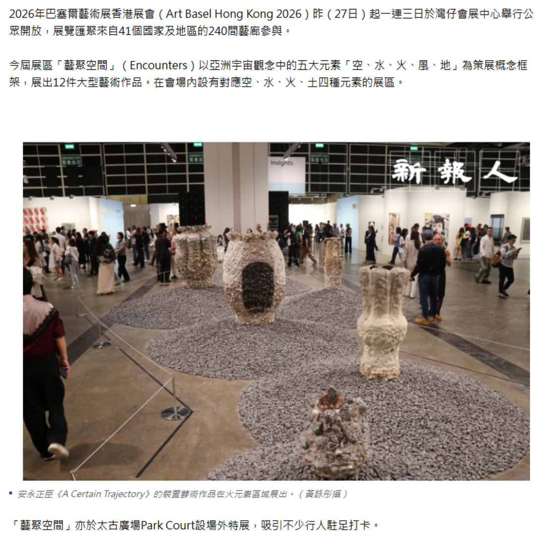 [傳媒報導 新報人]巴塞爾藝術展香港揭幕|五大元素貫穿「藝聚空間」 數碼藝術「Zero」亞洲首展 [傳媒報導 新報人]2026年巴塞爾藝術展香港展會(Art Basel Hong Kong 2026)昨(27日)起一連三日於灣仔會展中心舉行公眾開放,展覽匯聚來自41個國家及地區的240間藝廊參與。今屆展區「藝聚空間」(Encounters)以亞洲宇宙觀念中的五大元素「空、水、火、風、地」為策展概念框架,展出12件大型藝術作品。在會場內設有對應空、水、火、土四種元素的展區。